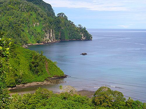 Su estructura basáltica, ante un régimen de lluvias como el mencionado, ha sido disectada para una red de drenaje considerable, manifiesto en una topografía muy irregular y de cascadas, de islas menores e islotes agrestes. La costa es muy sinuosa típica del océano Pacífico, sus acantilados tienen alturas hasta más de 183 metros. Posee una infinidad de cuevas submarinas. El mar azul turquesa es de extraordinaria transparencia.